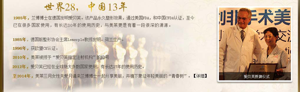 愛貝芙是一款安全使用歷史悠久的長(zhǎng)效注射美容產(chǎn)品,安全生產(chǎn)使用已經(jīng)28年,在中國已使用13年,是世界眾多明星們的駐顏秘訣。