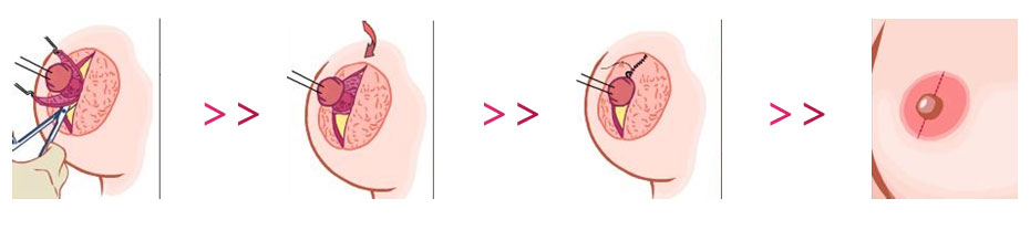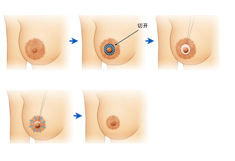 先將凹陷的乳頭提出體表,設計乳暈皮瓣,大小根據(jù)凹陷的程度及乳頭的大小而定,將乳頭邊沿分離,仔細分離和切斷乳腺管間的纖維束,糾正乳頭凹陷。再將部分乳腺組織充分的添于復位的乳頭下方空隙,固定乳頭頸,后縫合皮膚。
