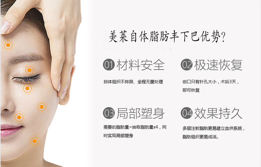 美麗迷人的臉型,不可缺少的就是一個精致的下巴,如今尖尖的下巴很受愛美女性的追捧。因而美萊自體脂肪豐下巴因其微創(chuàng),見效快等特點(diǎn),受到愛美者們的歡迎,是目前臨床上采用豐下巴的方式之一。